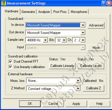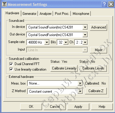 Пробовал я просто карточкой - пустая трата времени. Единственное исключение, наверное, встроенный в Компаки и ХП звук 3 Вт на 4 Ома, такое, наверное, потянет. Усилитель у меня "Эстония 010", может быть он не очень хороший, но для измерений его предостаточно. Вижу только один минус - много места на столе занимает. У Вас может быть любой усилитель, 10 Вт хватит! В двухканальном режиме его кривизна учтется, если он кривой. Важна, пожалуй, только нижняя граница АЧХ, мерить импеданс. Но на 100% не уверен.