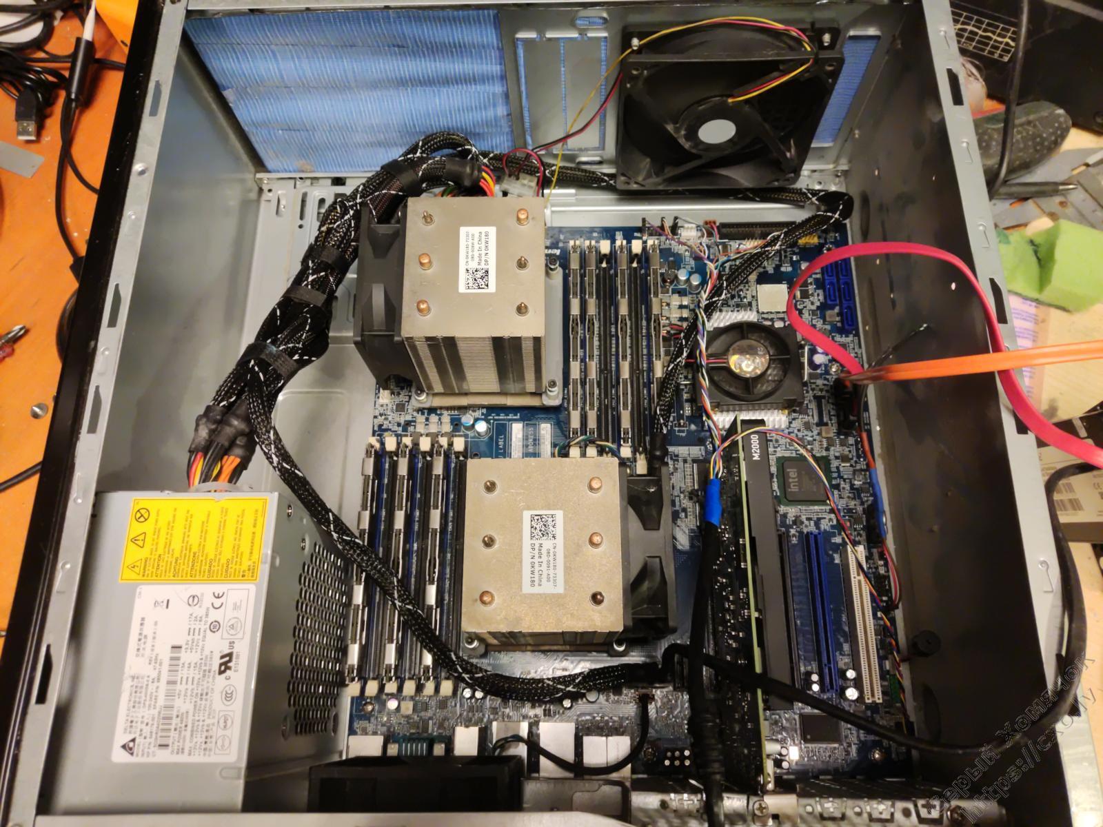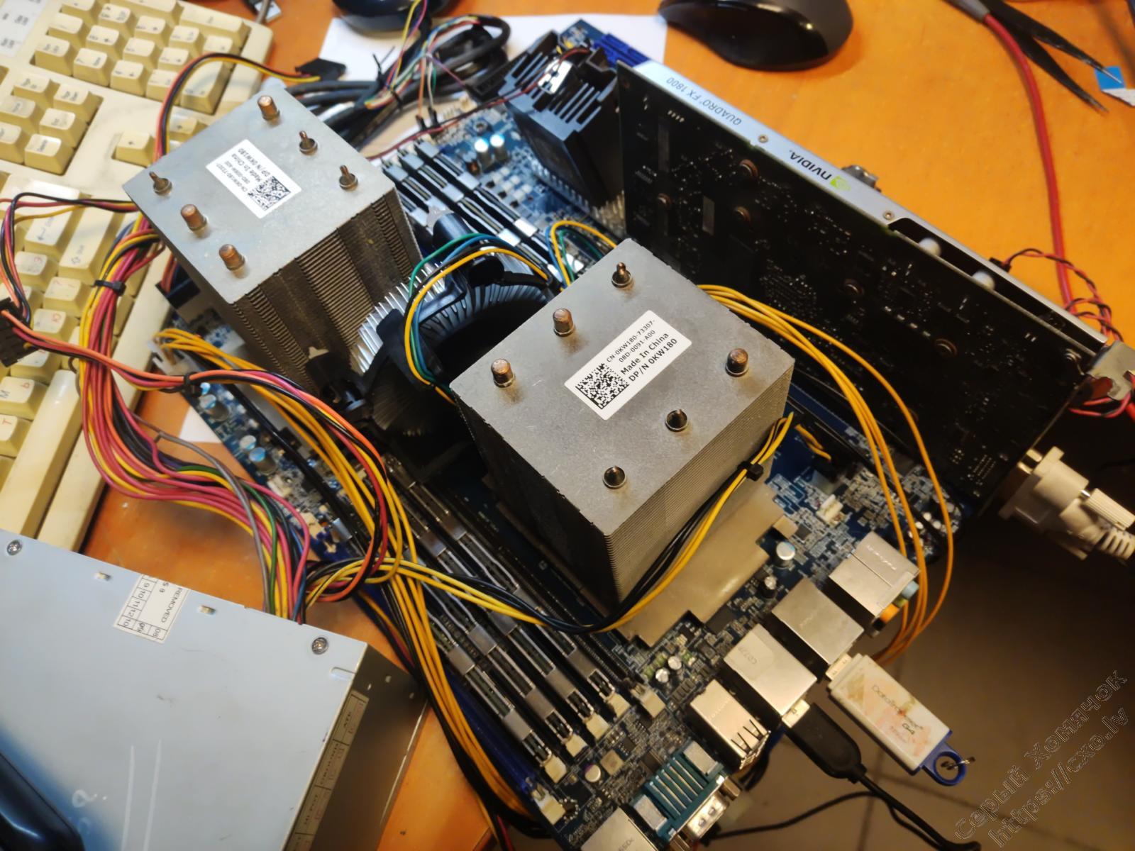Не хватало 10 пиновых разъёмов для питания процессоров, купил у поляков, закримпил, подоткнул первый попавшийся блок питания. БП придётся купить другой, сильно потолще, потому-что из линии 12В жрёт так, что у этого провода греются. Сильно греются, до дыма! Временно отключил гипертридинг и оставил по одному ядру на процессор включенными. Видео поставил из наличия, старинную запасную. Успешно завелось.