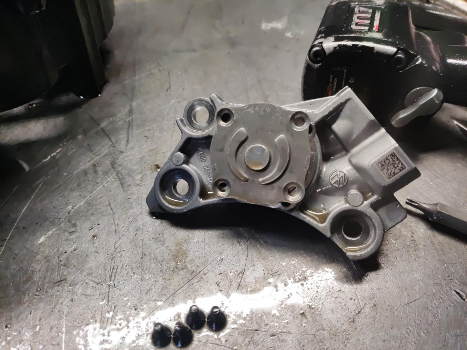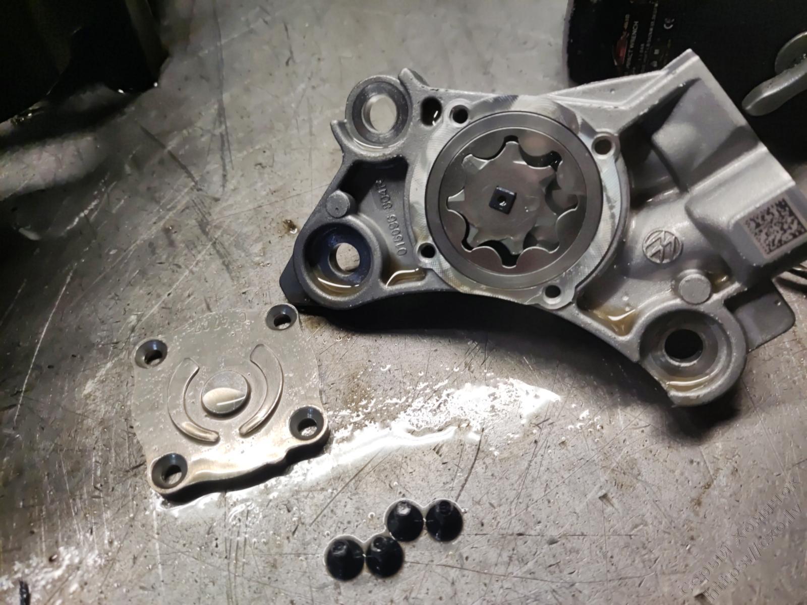 Почему разбирали. Маленький насосик электромоторчиком гоняет масло когда заглушн мотор. И вот эти четыре ссаных винтика держат крышку насоса. Сначала они просто откручивались, попадали между зубов и всё, приехали. Теперь они обновили прошивку и смотрят за давлением, как только крышка прослабляется надо ехать в ремонт.