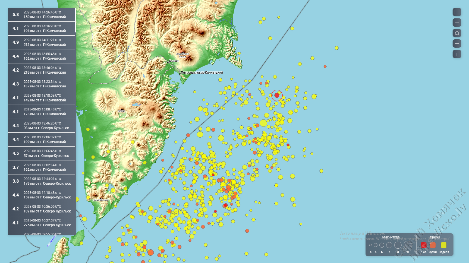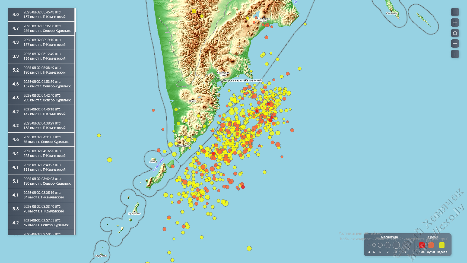 А основное землетрясение в Петропавловске произошло в прошлое воскресенье, в районе 18 часов, эпицентр около 150 км от Петропавловска, на глубине 10 км, магнитуда 7,4.