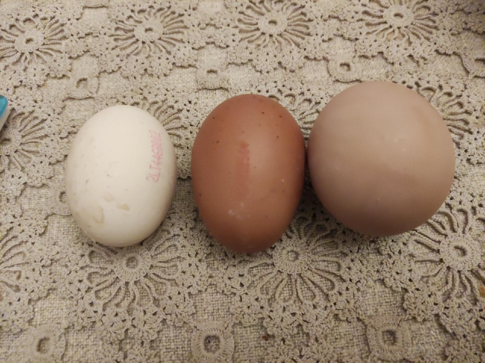Левое яйцо среднего размера, среднее - большое (74 грамма), правое тоже куриное, но весит 100 граммов. На сковороде выглядело обычно. Вырос бы цыплёнок мутант, небось!